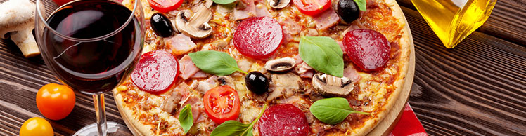 mit Tomatensauce, Mozzarella, Schinken, Salami, Champignons, schwarze Oliven, Paprika